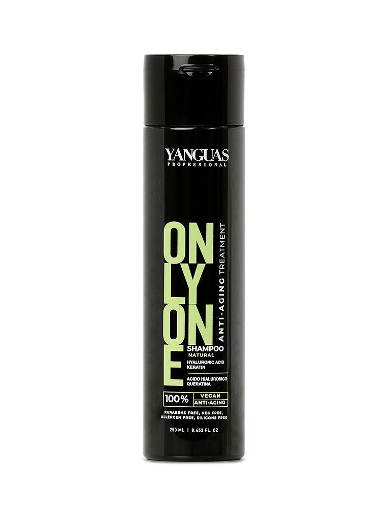 ONLY ONE champú de Tratamiento Anti-Edad 250 ml. Con ácido hialurónico, queratina vegetal, proteína de avena y aceite de babassú. Libre de sulfatos, parabenos y alérgenos. Vegano